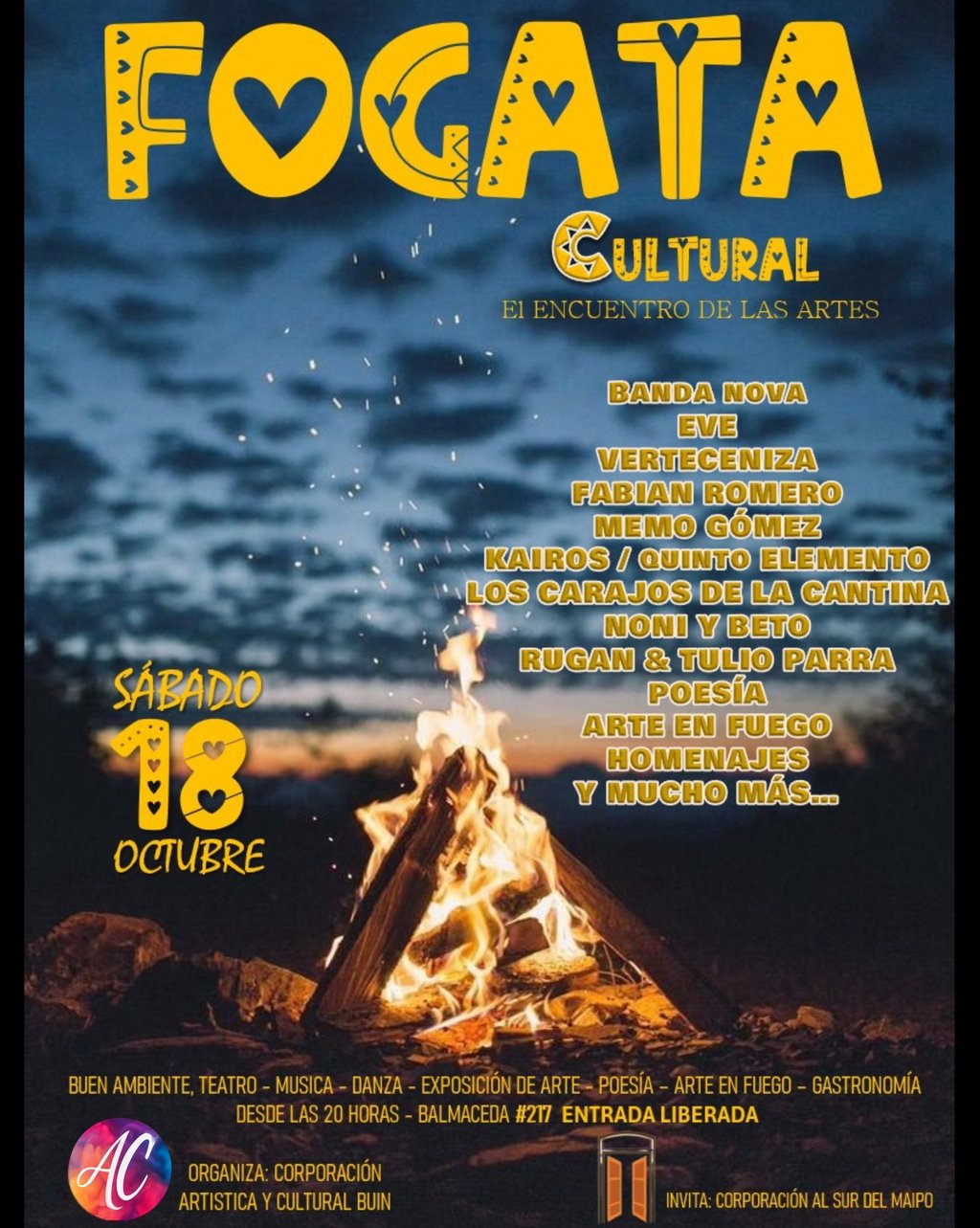 Ahora si que si- Este sábado 18 de octubre, la Corporación Artística y Cultural Buin se prepara para presentar una nueva versión de la Fogata Cultural, un evento que ha cobrado gran relevancia en la comuna y que se ha convertido en un espacio emblemático para el encuentro de diversas expresiones artísticas. Este año, se espera que la participación de artistas locales sea aún más notable, ofreciendo un repertorio variado que busca celebrar la cultura y el talento de la región.