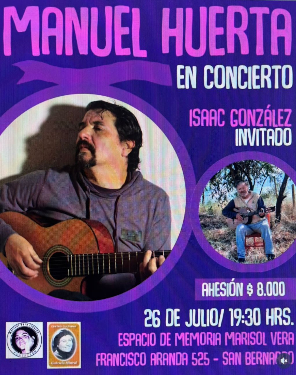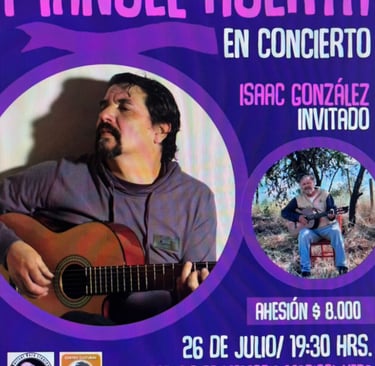 Nuestro amigo y compañero cantautor Manuel Huerta Catalán, realizará un concierto, el que tendrá como invitado además a Isaac Gonzalez. Este concierto imperdible sera en el Espacio Memoria Marisol Vera, ubicado en Francisco Aranda 525 comuna de San Bernardo.